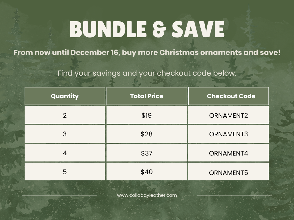 ** As is the charm of all handmade items, each ornament will have slight variances in the leather. This ensures that each Colladay Leather product you purchase is truly one-of-a-kind.